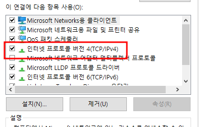 인터넷 프로토콜 버전 4(TCP/IPv4)로 들어가줍니다