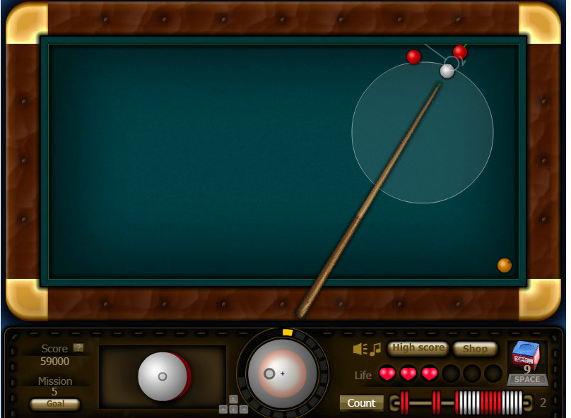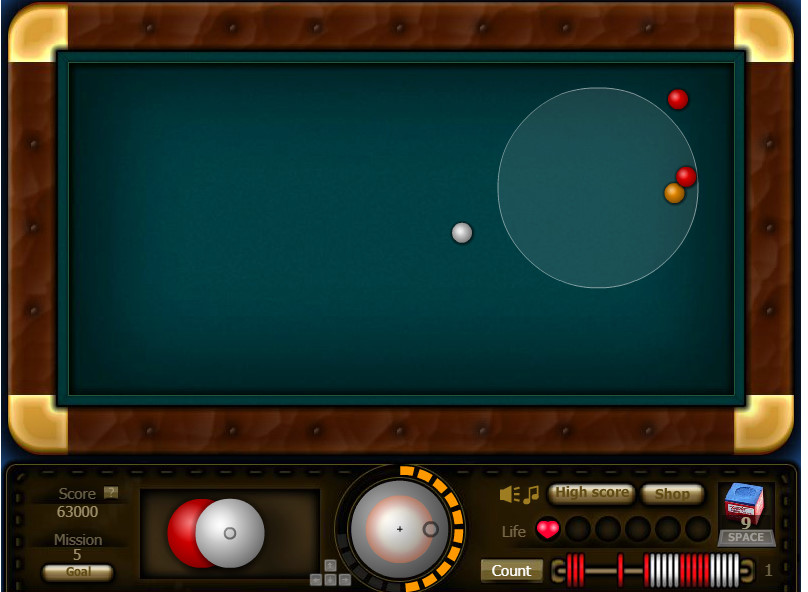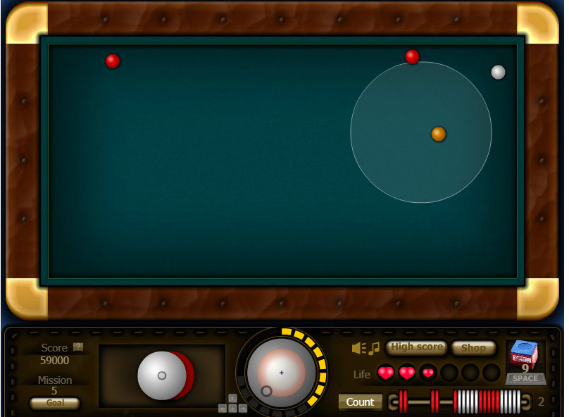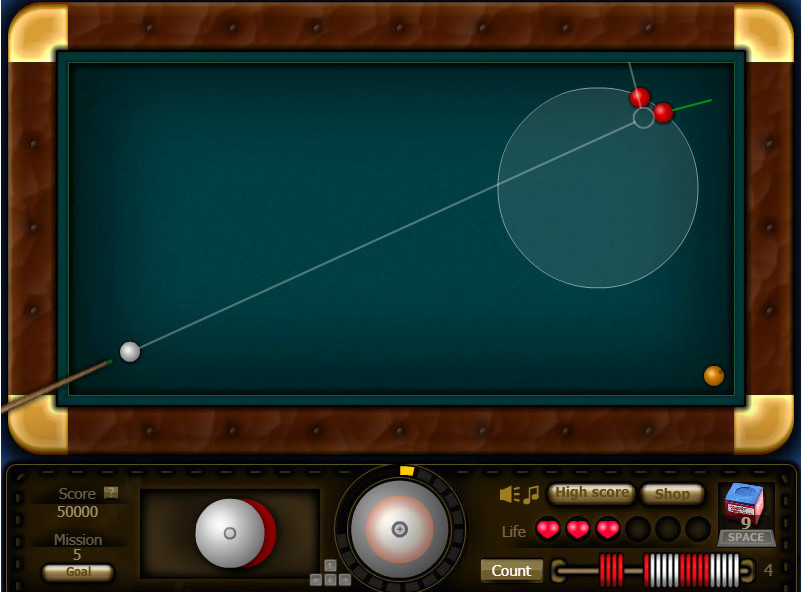 4구당구게임의 플레이 방법은 이렇습니다 자신의 공(흰색)을 쳐서 빨간색의 공을 연달아 맞추거나 쿠션을 활용해 공이 멈출때까지만 맞추면 됩니다